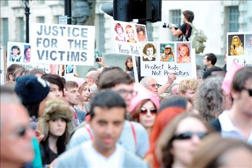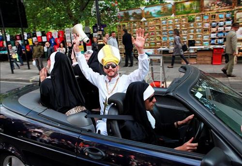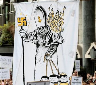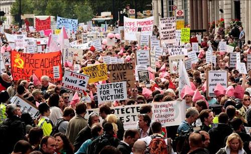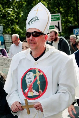 Un manifestante disfrazado del Pontífice participa en una marcha de protesta contra la visita de Estado del papa Benedicto XVI al Reino Unido.