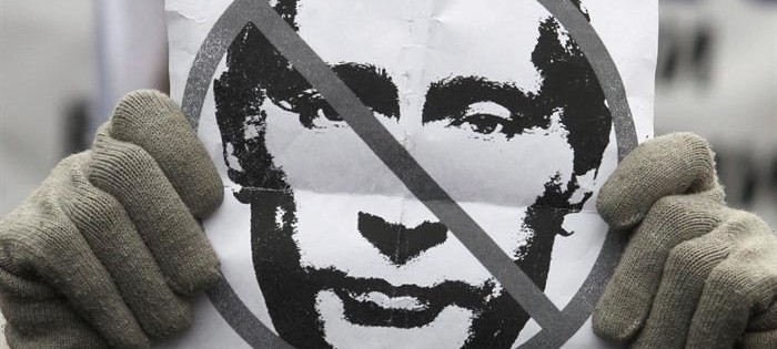 Mascarillas y pancartas contra el presidente de Rusia.