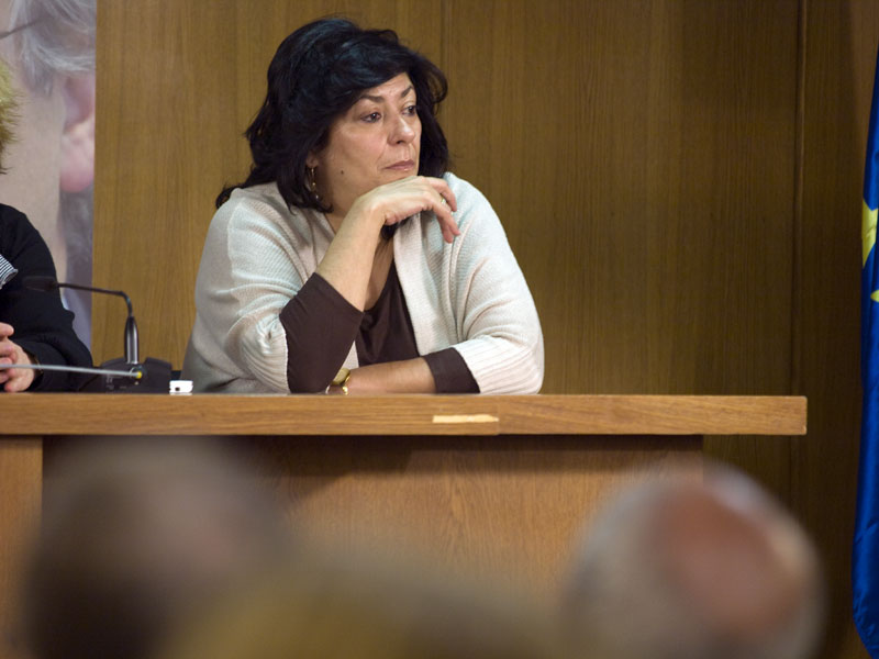 Almudena Grandes escucha atentamente el testimonio de Gervasio Puerta.