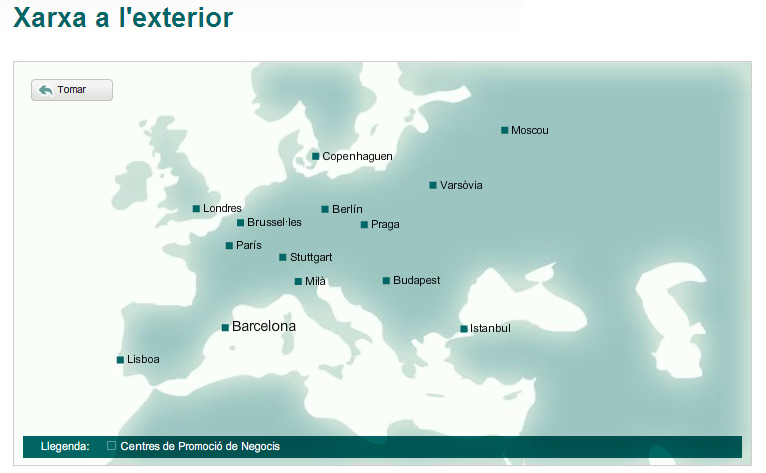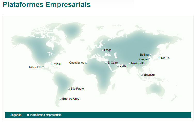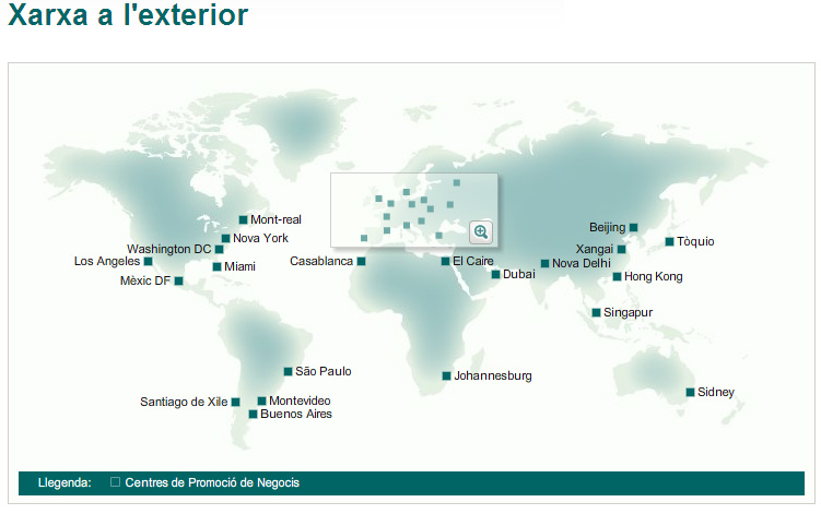 Mapa de la presencia global de las delegaciones y plataformas empresariales de Acc1ó, agencia dependiente de la Generalidad.
