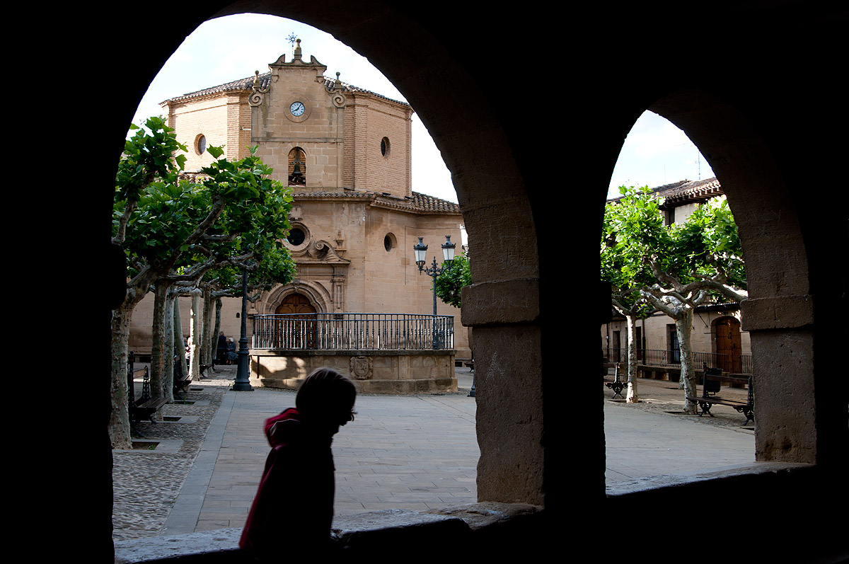 La Ermita de Nuestra Señora de la Plaza, en Elciego, a través de los arcos del Ayuntamiento. La Ermita es un bonito edificio del S XVIII, la misma época en la que fue construido el propio consistorio, con un estilo muy típico de los edificios municipales en el País Vasco y el escudo de Felipe II en la fachada