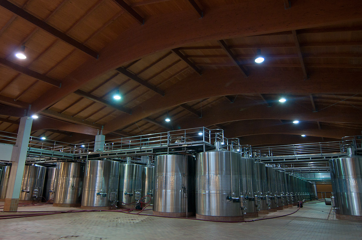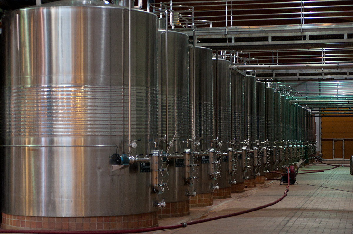 En estos enormes tanques de acero inoxidable el vino Marqués de Riscal inicia el proceso que lo convierte en un excelente Rioja