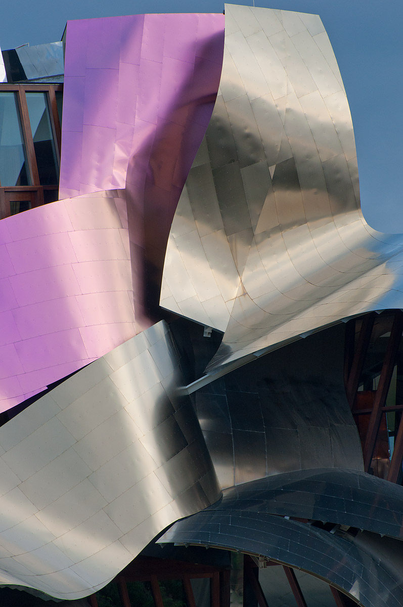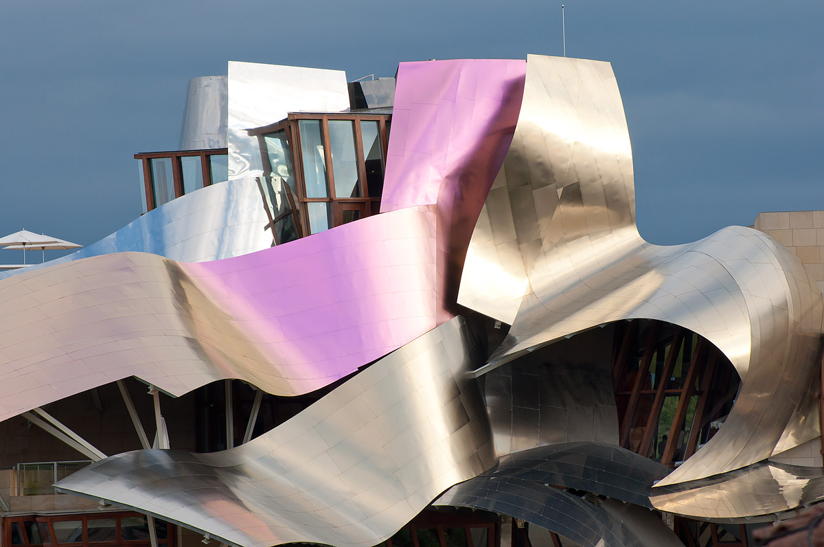Las estructuras metálicas que cubren el edificio del hotel, inspiradas al parecer en las hojas de una vid, son un auténtico espectáculo con sus cambios de color y tonalidad según va cambiando la luz ambiental