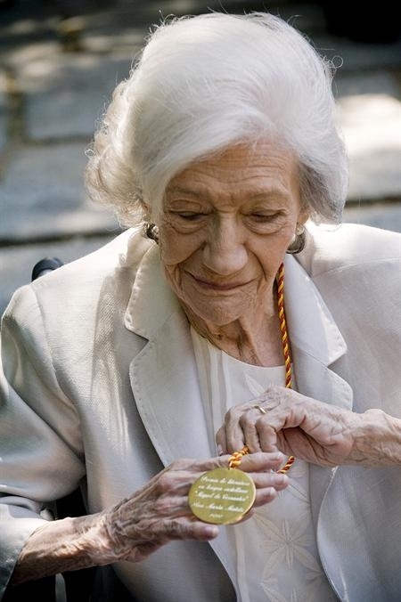 Imagen muy emotiva en la que Ana María Matute muestra la medalla del Premio Cervantes