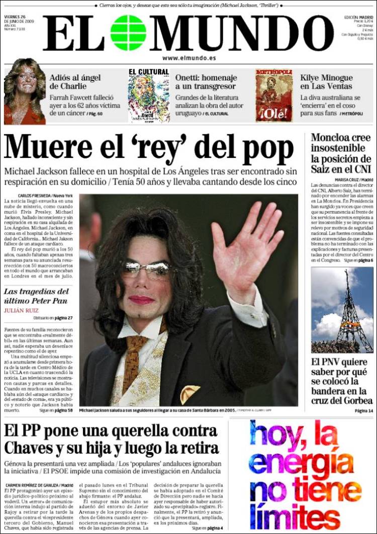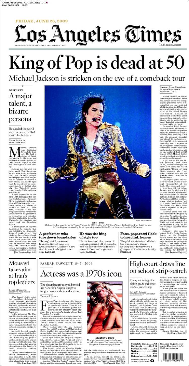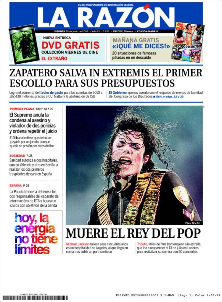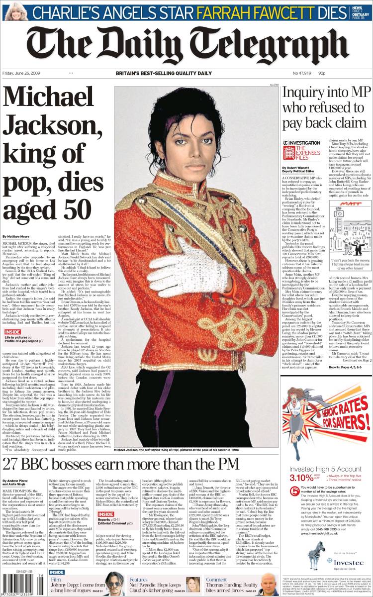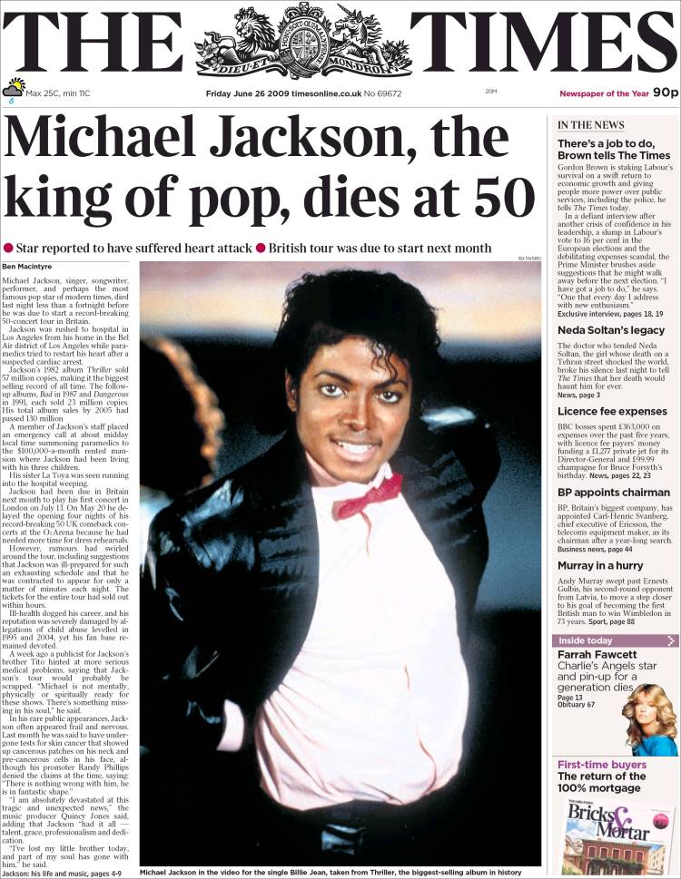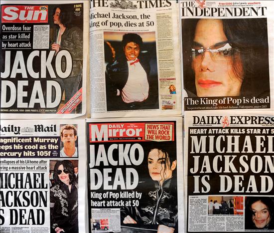 Imagen de las portadas de los principales diarios británicos que se hacen eco de la noticia de la muerte de Michael Jackson. (EFE)