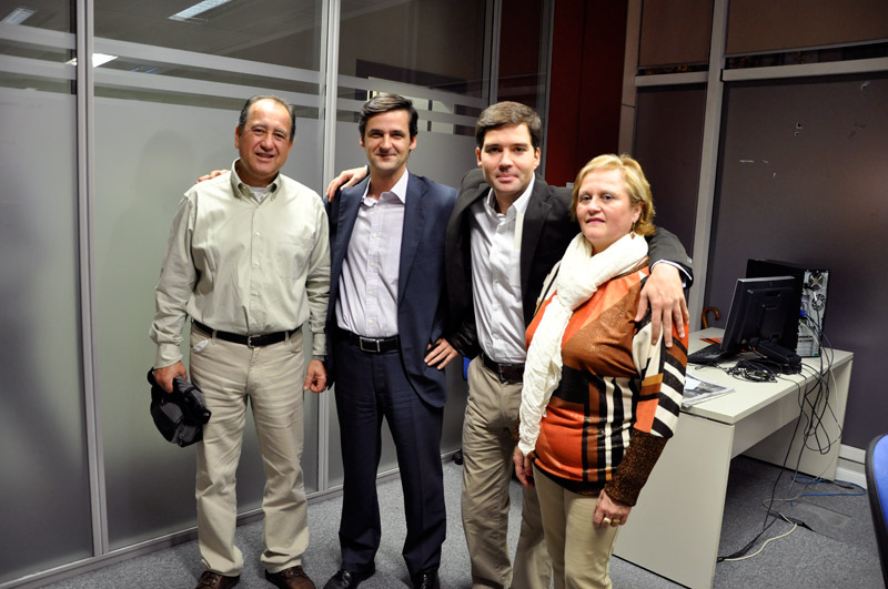 Los socios, que acudieron desde Avilés, en la redacción de informativos de esRadio con Javier Somalo, Dieter Brandau y Tania Lastra, también asturiana. LD / D.A.