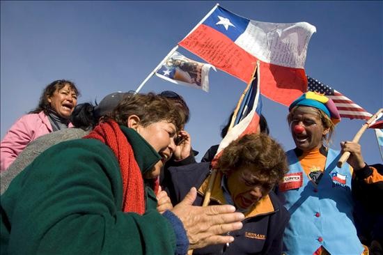 Familiares del minero atrapado Darío Segovia emocionados este sábado 9 de octubre de 2010, ante la llegada de la máquina "Schramm T-130", bautizada como "La Liebre" por su rapidez, al taller subterráneo donde se encuentran atrapados los 33 mineros desde hace 64 días