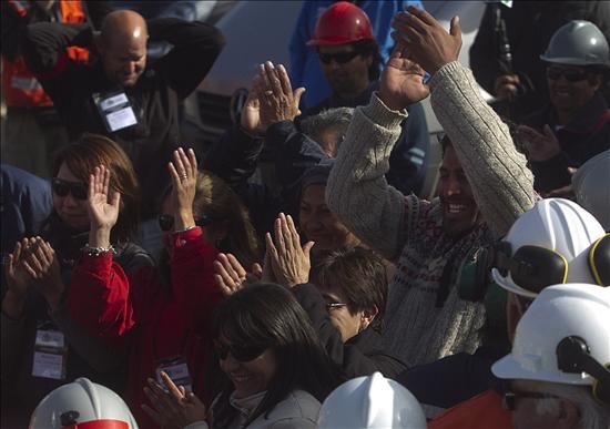 Familiares aplauden este ábado 9 de octubre de 2010, en el yacimiento San José, Copiapó (Chile), después de que la máquina "Schramm T-130", denominada "Plan B", llegó al taller a 630 metros de profundidad donde están los 33 mineros atrapados desde hace 64 días