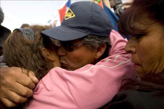 Familiares del minero atrapado Darío Segovia se abrazan este sábado 9 de octubre de 2010, ante la llegada de la máquina "Schramm T-130", bautizada como "La Liebre" por su rapidez, al taller subterráneo donde se encuentran atrapados los 33 mineros desde hace 64 días