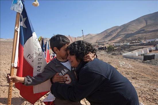 Jessica Yañez esposa del minero atrapado Esteban Rojas abraza a su nieto Bryan este sábado 9 de octubre de 2010, ante la llegada de la máquina "Schramm T-130", bautizada como "La Liebre" por su rapidez, al taller subterráneo donde se encuentran atrapados los 33 mineros desde hace 64 días