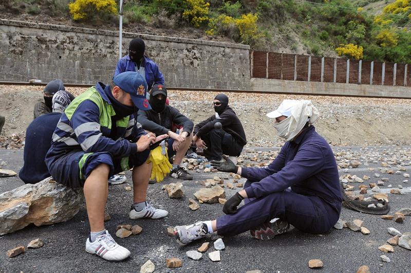 Los mineros bloquean, con piedras sobre el asfalto, la carretera N-630, en Ciñera (León)