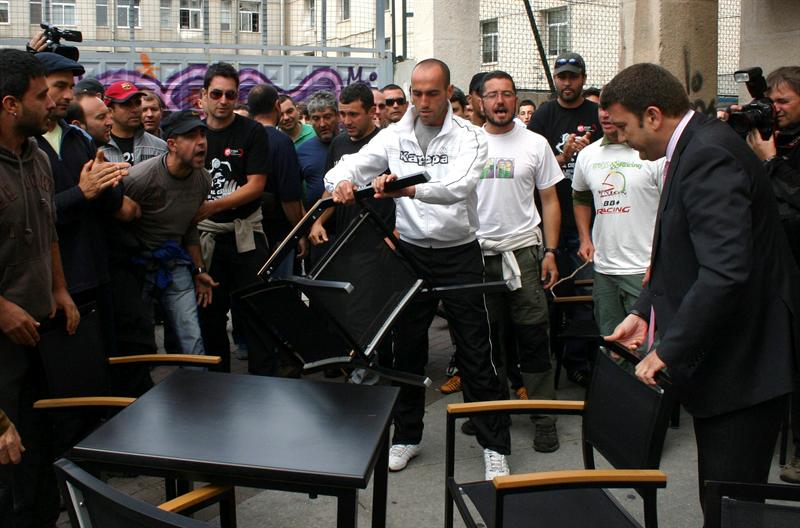 El alcalde de Ponferrada, Carlos López Riesco (dcha), ante el piquete de mineros que se enfrentó a él en la terraza de un bar donde tomaba café