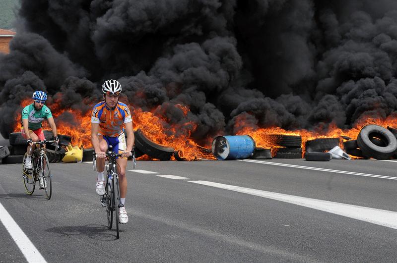 Dos ciclistas, ante la barricada en llamas con la que un piquete de mineros cortó el tráfico en ambos sentidos en la N-630 (León-Asturias) a su paso por La Robla