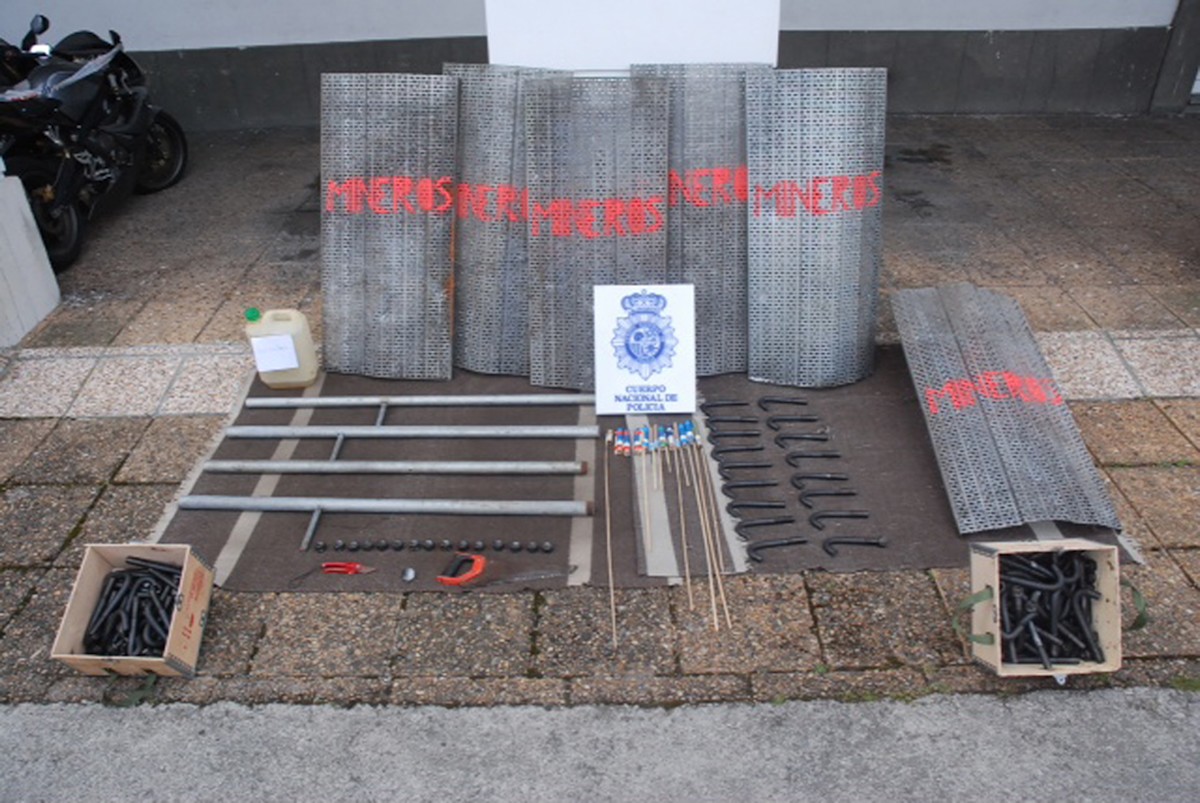 Material incautado por la Policía Nacional en las movilizaciones que están llevando a cabo los mineros en el Pozo de Sotón (Asturias)