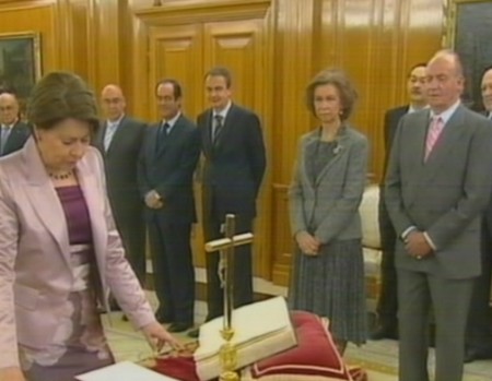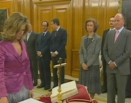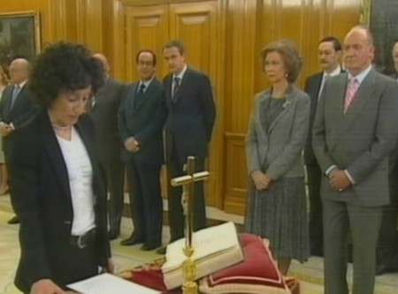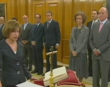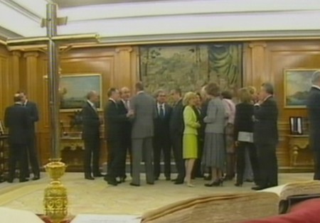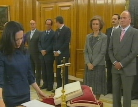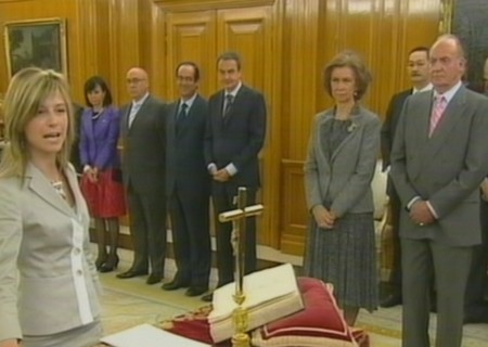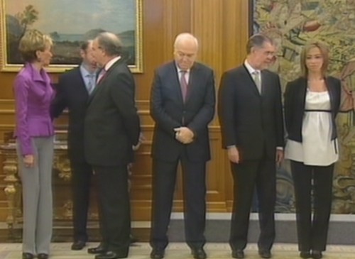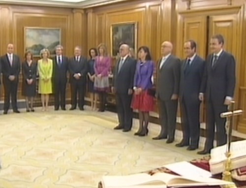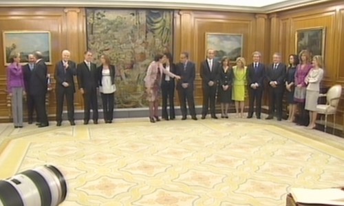 Algunos de los personajes más polémicos de la anterior legislatura, como Moratinos o Bermejo aparecen esperando su turno cerca de Carme Chacón, la flamante ministra de Defensa pacifista.(Imagen de LDTV)