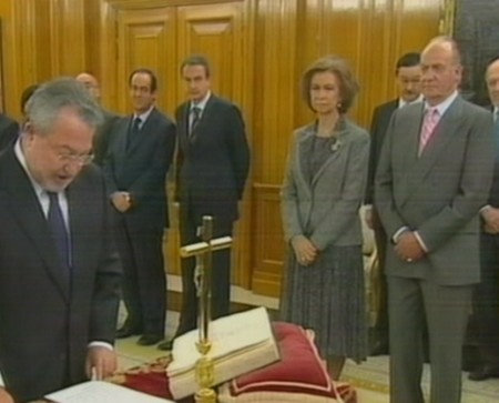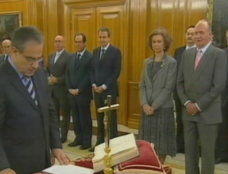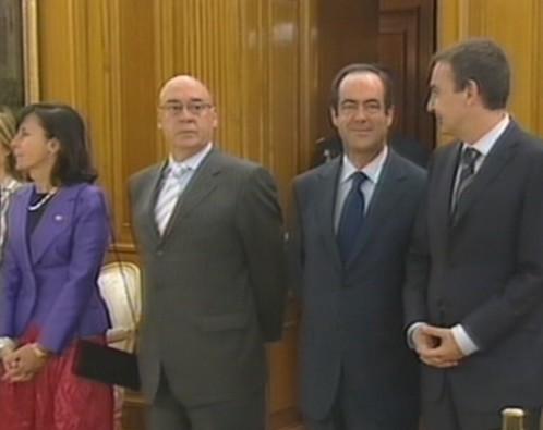 Algunos de los ministros del Ejecutivo de Rodríguez Zapatero, como Molina, Soria, Salgado y Corredor esperan su turno para prometer su nuevo cargo ante el Monarca. (Imagen LDTV)