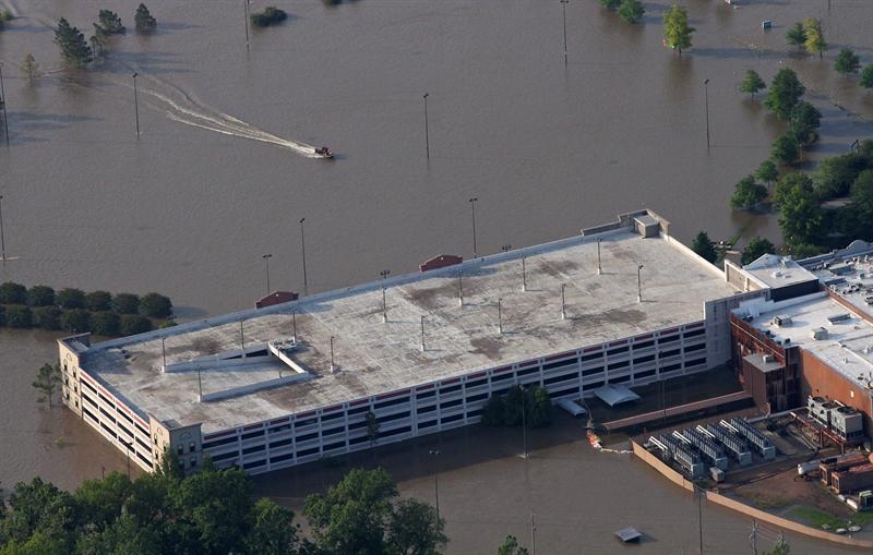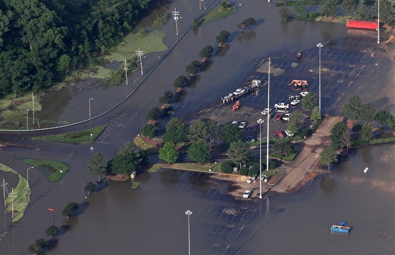 Vista del aparcamiento de un casino anegado por la cresta de la crecida del río Misispi en Tunica.