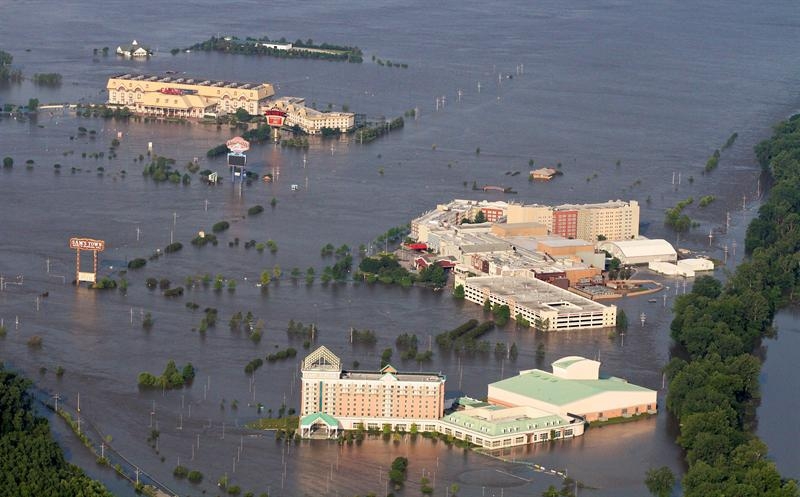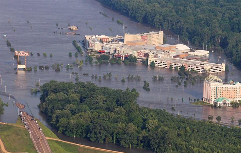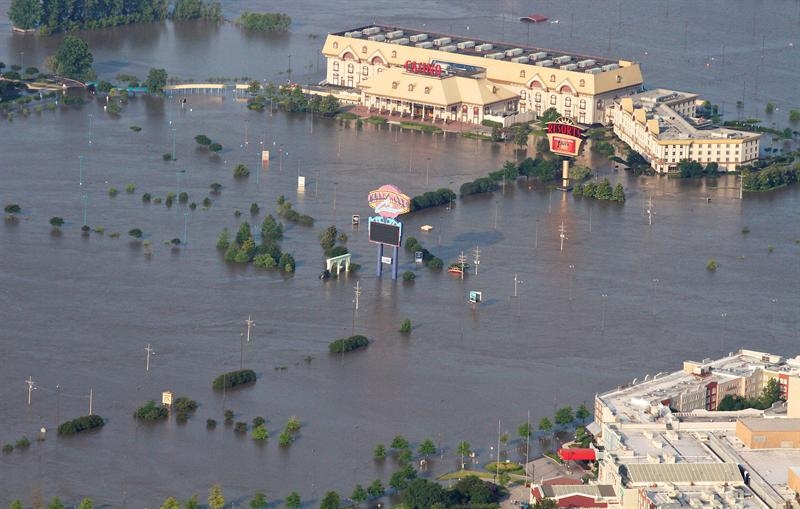Vista de un casino anegado por la cresta de la crecida del río Misisipí en Tunica.