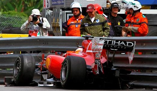 El piloto español de Fórmula Uno Fernando Alonso, de la escudería Ferrari, choca rompe el chasis de su monoplaza después chocar en la curva de Massenet a causa de un bloqueo en sus frenos durante la última sesión libre del Gran Premio de Mónaco.