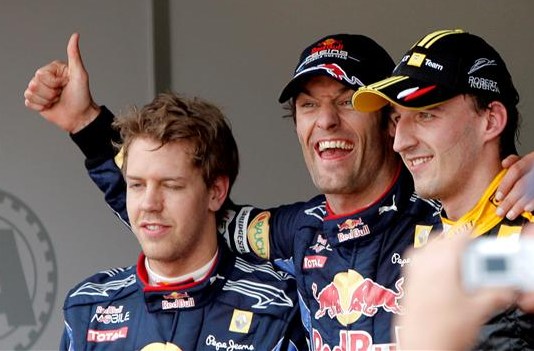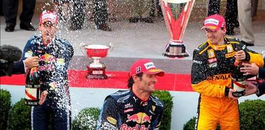 El piloto australianode Red Bull Racing Mark Webber (c), vencedor de la prueba, su compañero de equipo el alemán Sebastian Vettel (i), segundo clasificado, y el polaco de Renault Robert Kubica (d), tercer clasificado.