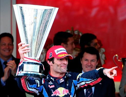 El piloto australiano de Fórmula Uno Mark Webber, de Red Bull Racing, celebra en el podio su victoria en el Gran Premio de Mónaco.