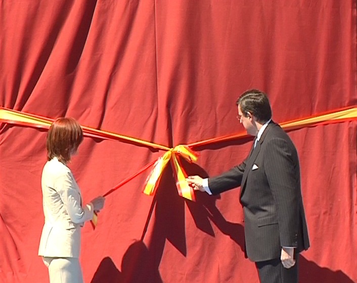 Maite Pagazaurtundua y Alfredo Dagnino descubren el monumento, obra del artista Alfonso Amaya.