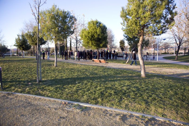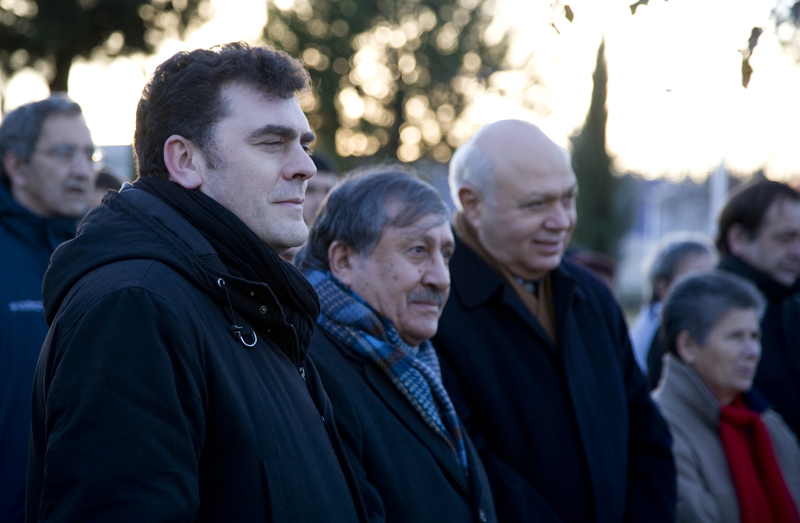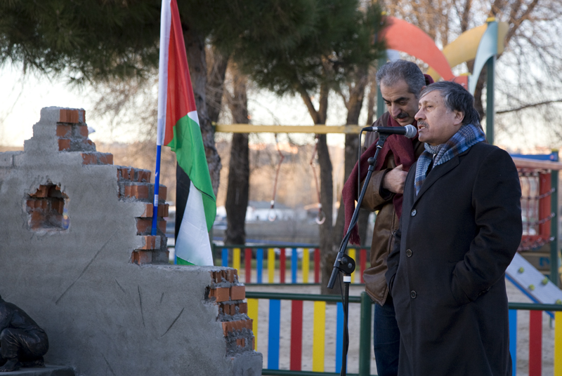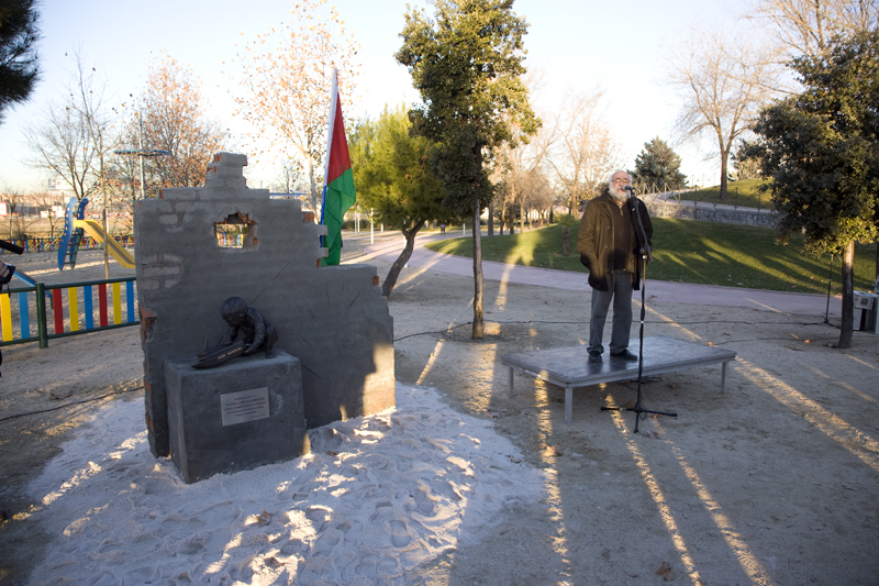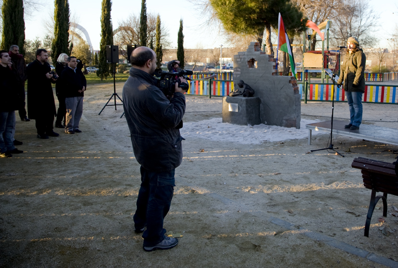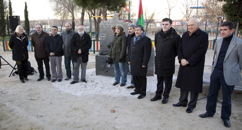 De izquierda a derecha los protagonistas (y casi únicos asistentes) al homenaje. Ann Wright, activista de izquierdas norteamericana, José Castejón, concejal de Cultura (IU), Ahmet Emin Dag, activista turco, Manuel Tapial, activista español, Manuel Espinar, comunista histórico del sur de Madrid y padre del anterior, Laura Arau, activista española, Alarico Rubio, concejal de educación (IU), Musa Amer Odeh, delegado de la ANP en España, Rafael Gómez Montoya, alcalde de Leganés (PSOE), Ender Arat, embajador turco en España, y Raúl Calle, concejal de urbanismo (IU).