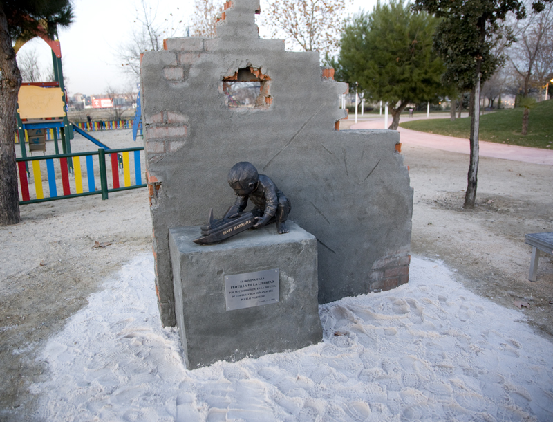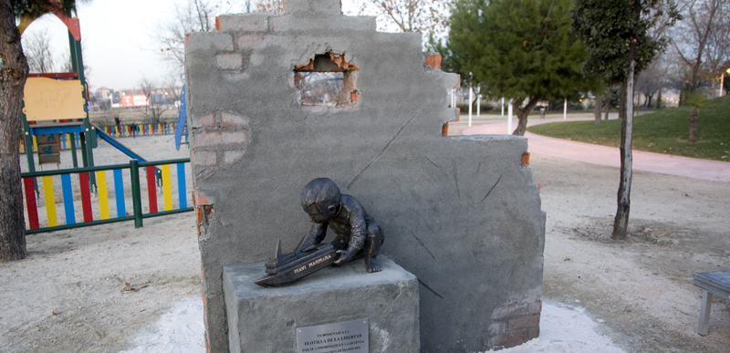 Un murete a medio terminar con una placa y la estatua de un niño que juega con una réplica del Mavi Marmara. Ha sido levantado por una escuela-taller del ayuntamiento.