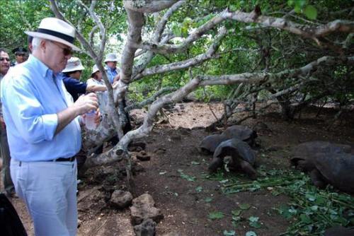 Moratinos coge en sus manos una tortuga, durante estancia en San Cristóbal, en islas Galapagos (Ecuador), para supervisar los proyectos que la cooperación española desarrolla en las islas ecuatorianas. (EFE)
