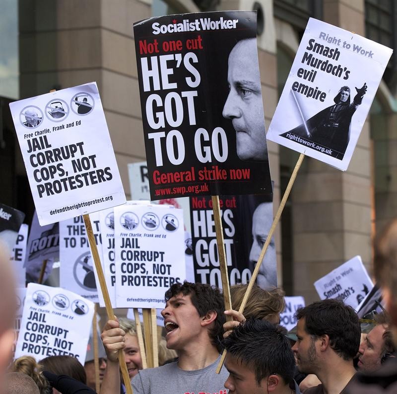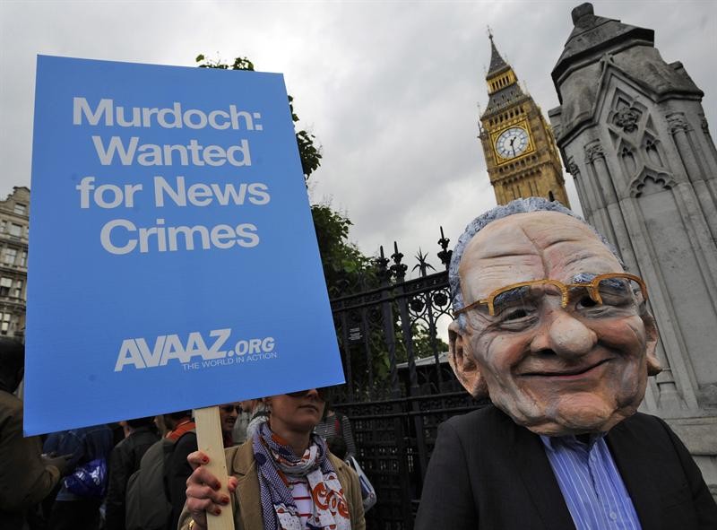 Carteles contra Rupert Murdoch en la entrada del Parlamento Británico.