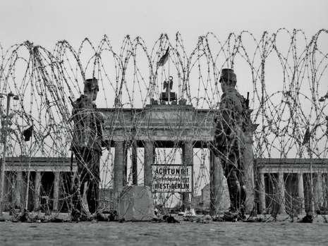 La célebre Puerta de Brandeburgo custodiada por soldados el día que comenzó la construcción del muro en agosto de 1961.