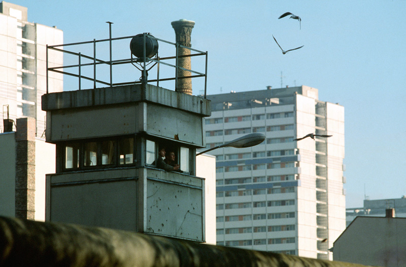 Dos guardias germanoorientales dan de comer a los pájaros desde una de las torres de vigilancia en 1989. Al muro le quedaba ya muy poco de vida.