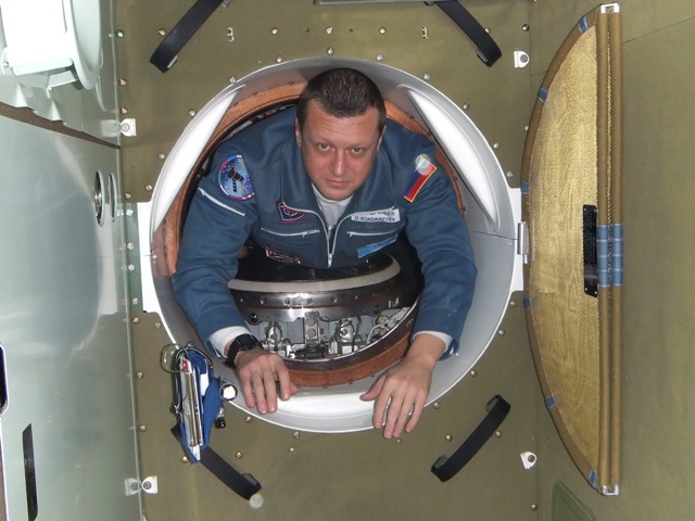 El cosmonauta Dimitri Kondratiev accede al módulo orbital a través de un estrecho pasillo. Después de cada lanzamiento la nave tarda dos días en encontrarse con la EEI, tiempo que tienen que pasar en este espacio tan reducido.