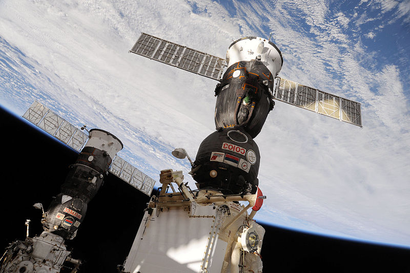 En la imagen una Soyuz (en primer plano) y una Progress (en segundo plano) acopladas a la EEI. La Soyuz son el "ascensor espacial" de la estación, las Progress suben carga y luego se queman en la atmósfera con la basura que generan los astronautas de la EEI.