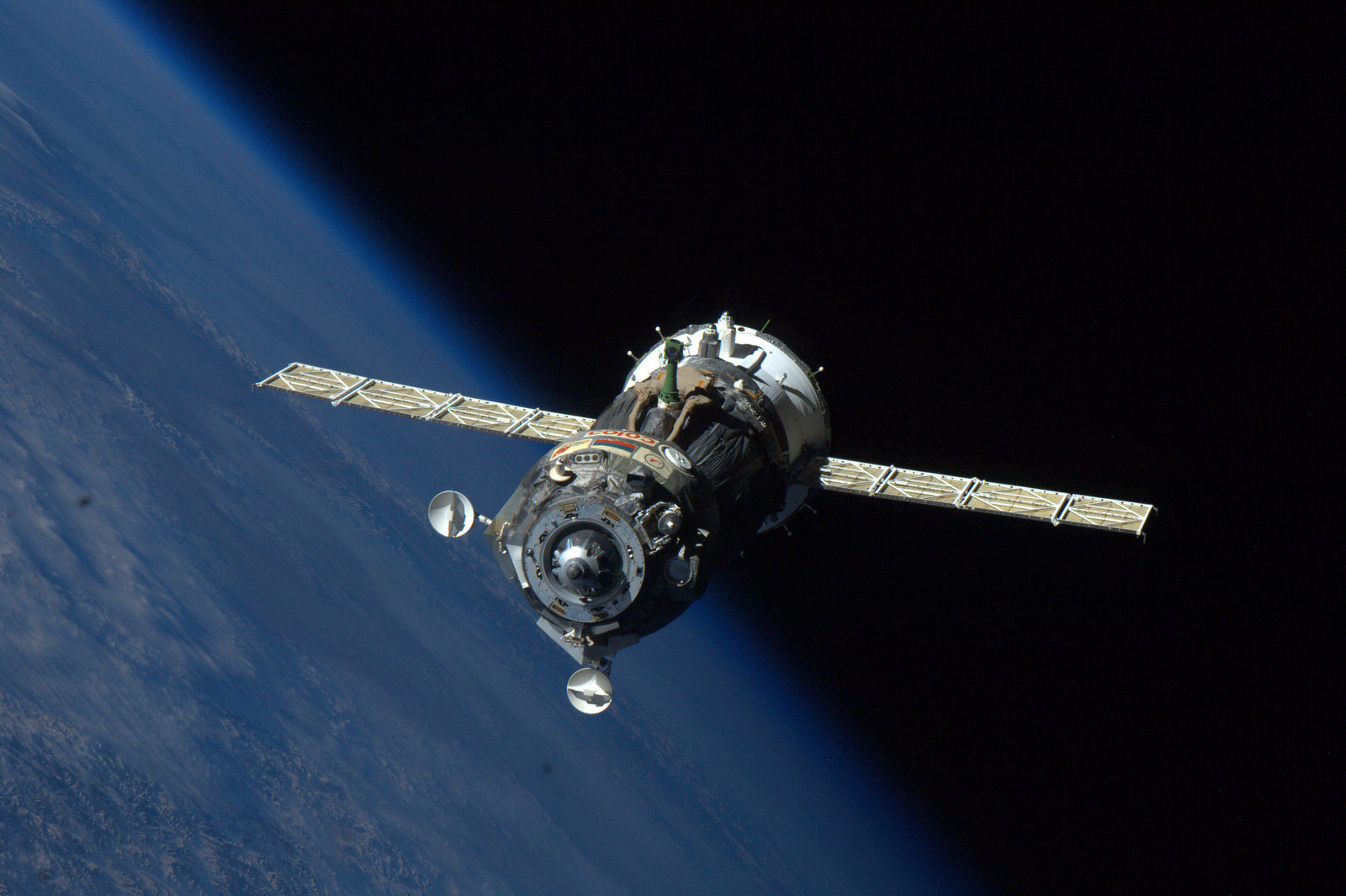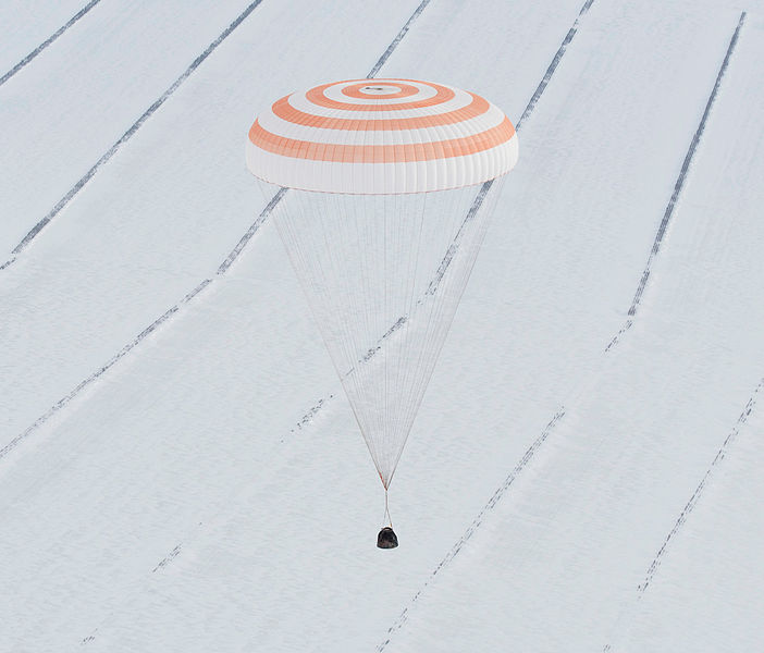 Una vez concluida la misión los astronautas (nunca más de tres) vuelven a la Tierra a bordo del llamado módulo de descenso, una pequeña cápsula que precisa de un gran paracaídas para detener la caída sobre el desierto de Asia Central.