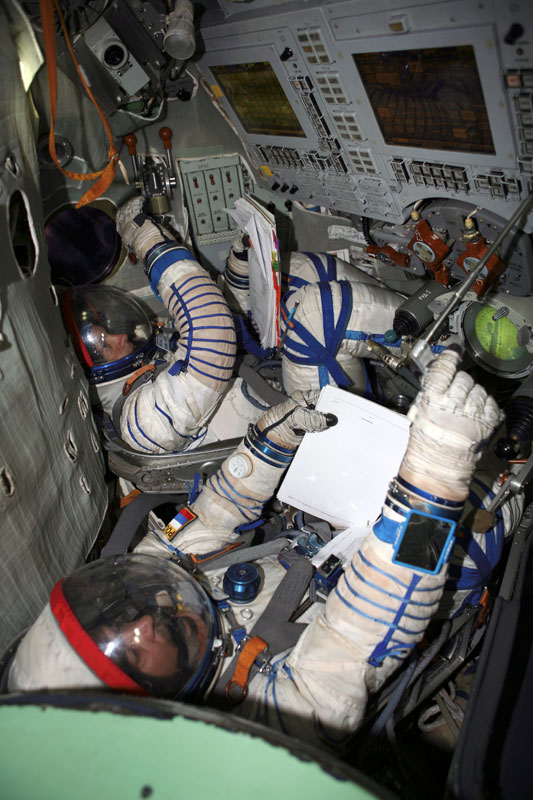 El interior de las Soyuz no es precisamente espacioso. Los cosmonautas ascienden y descienden del espacio muy apretados tal y como se puede apreciar en la imagen. En las misiones con tres tripulantes en tercero van en el medio.