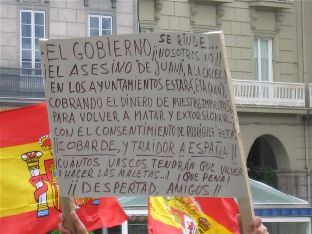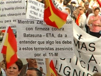 Numerosos carteles reprochaban a Zapatero su cesión ante los terroristas de ETA. (LDTV)