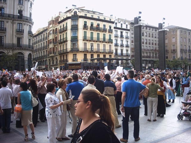 Cientos de personas han respondido a la convocatoria de la AVT en Zaragoza, que se ha visto ensombrecida por la tensión entre los manifestantes y los intérpretes de un desfile de moros y cristianos. (Luis)