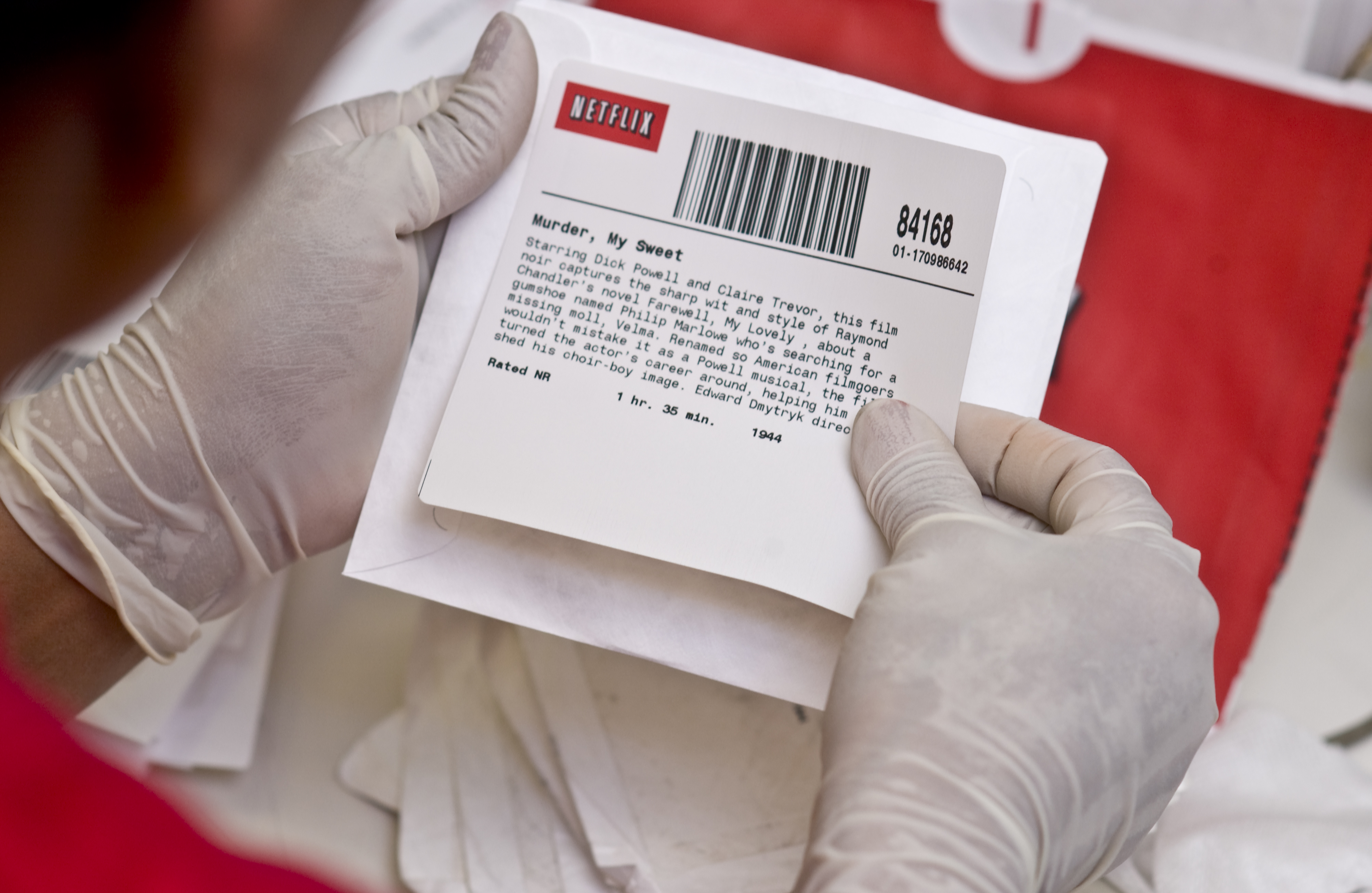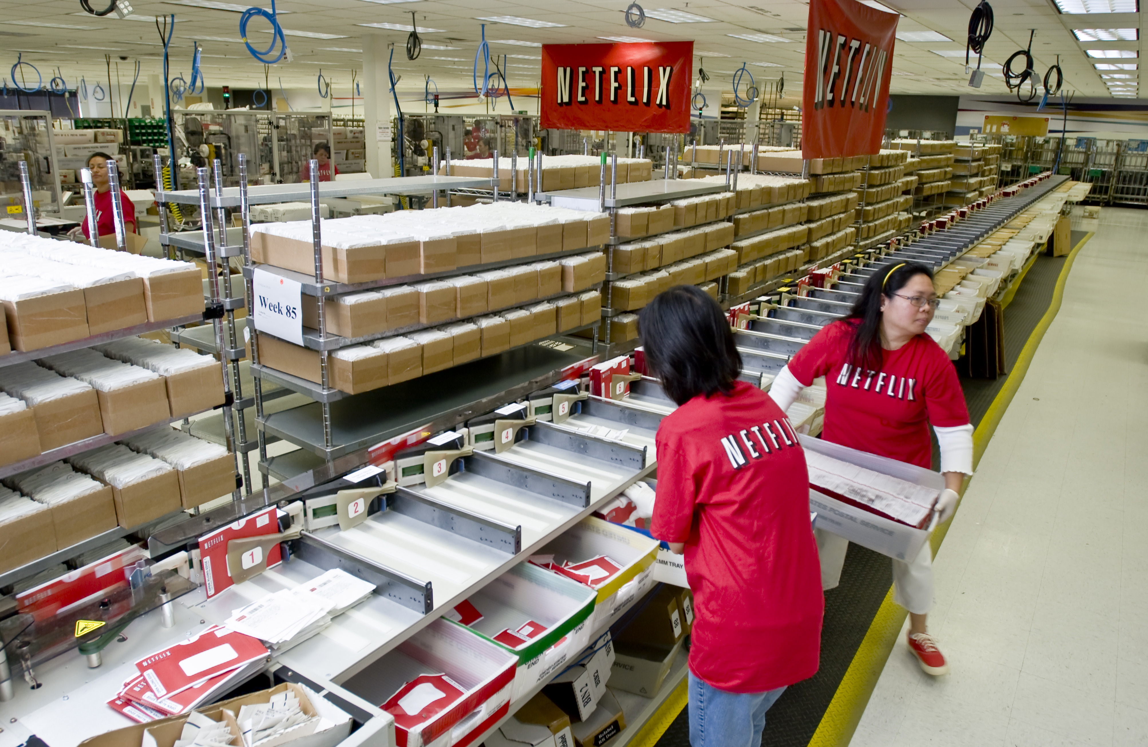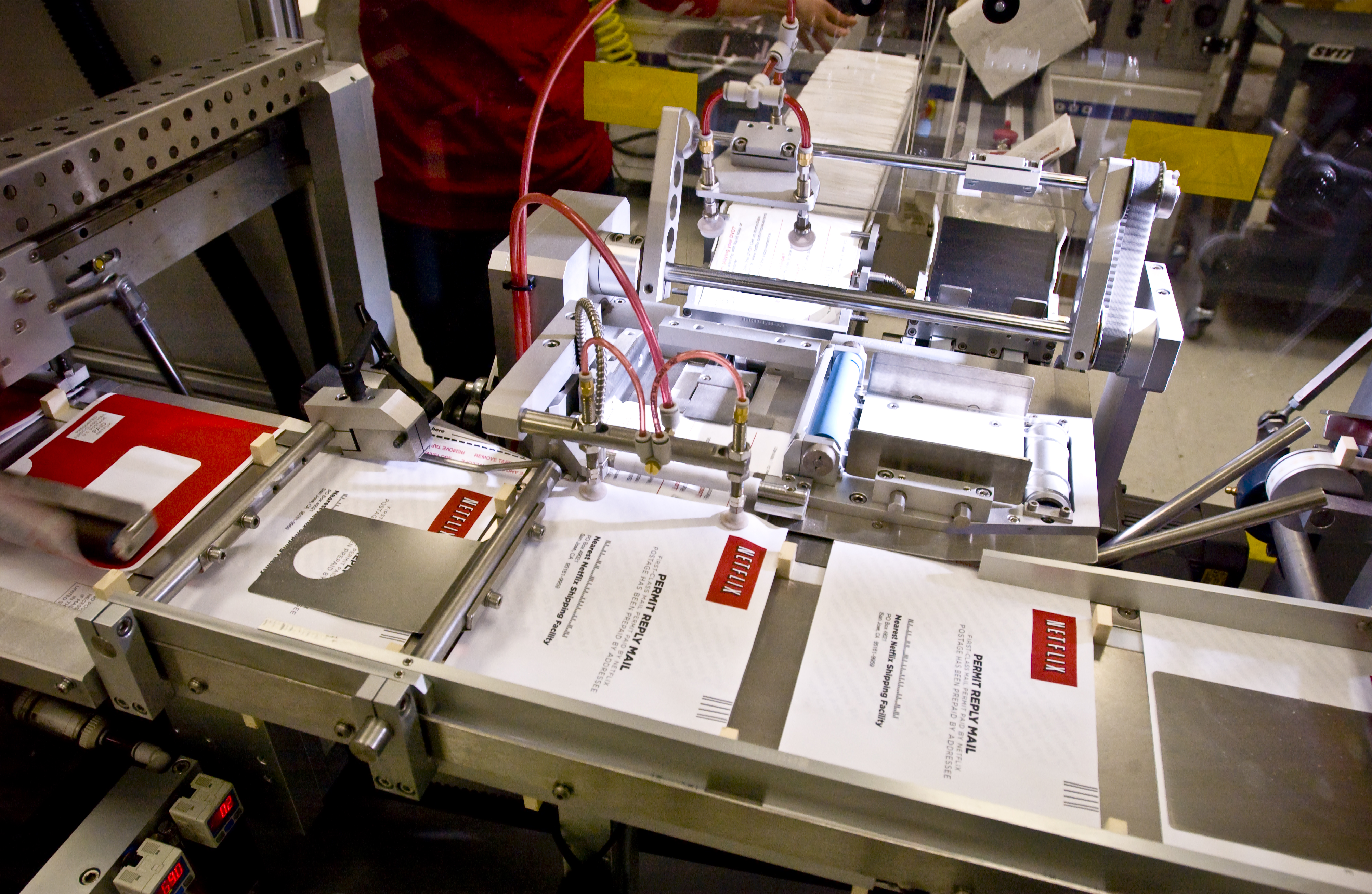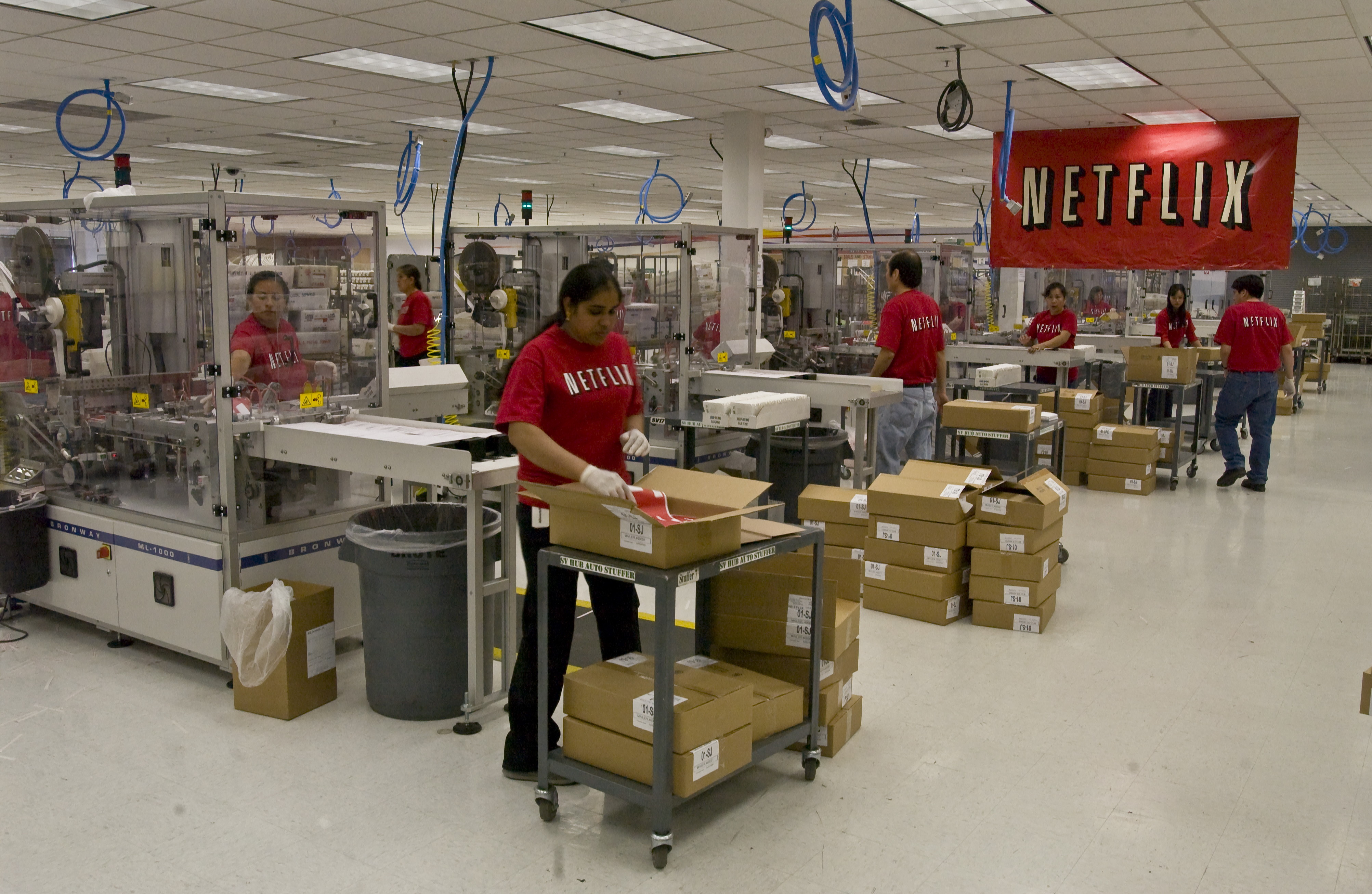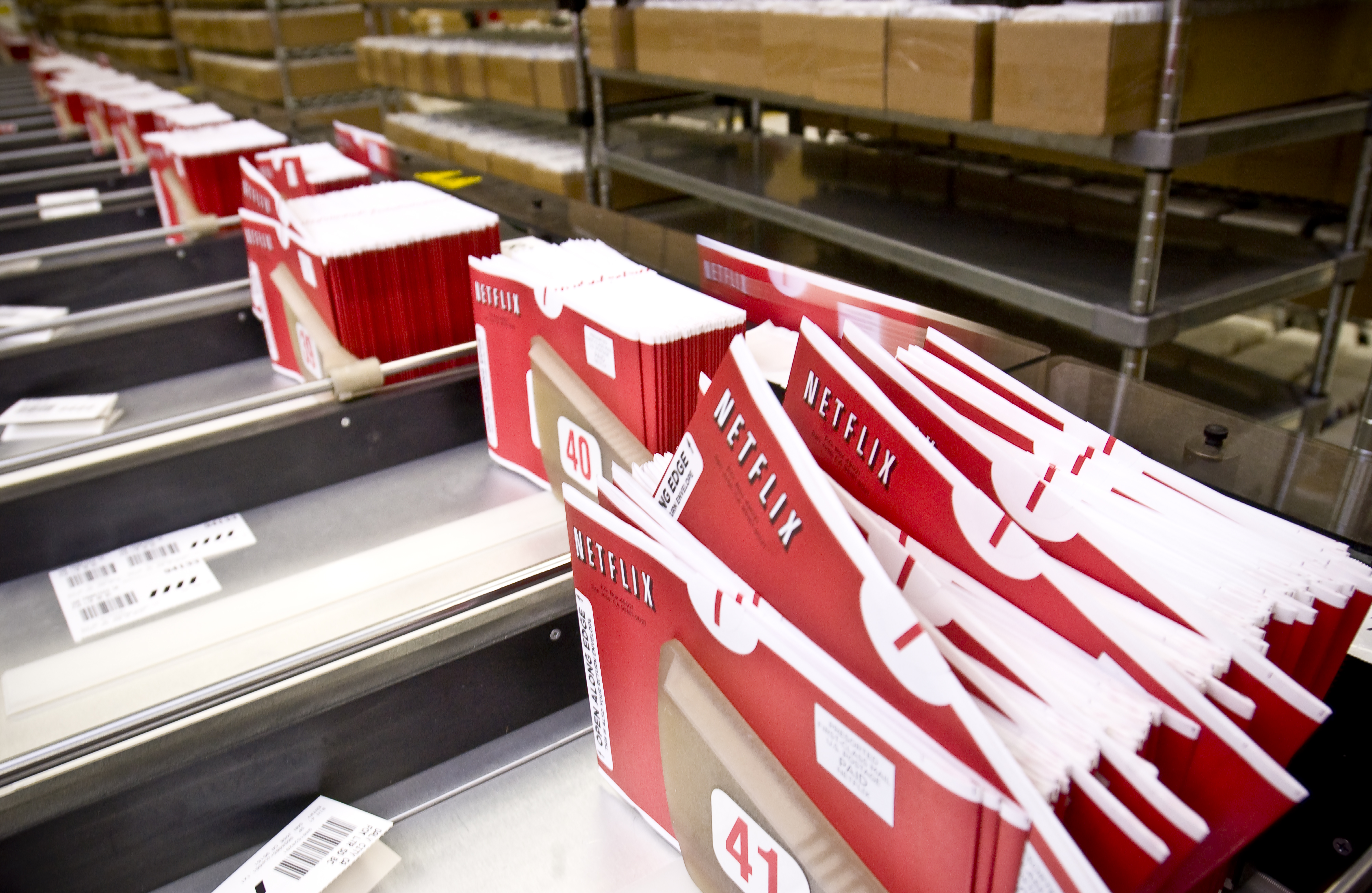 Las máquinas leen un código de barras incluido en cada sobre para ordenar los sobres automáticamente por código postal. Netflix envía millón y medio de DVD cada día.