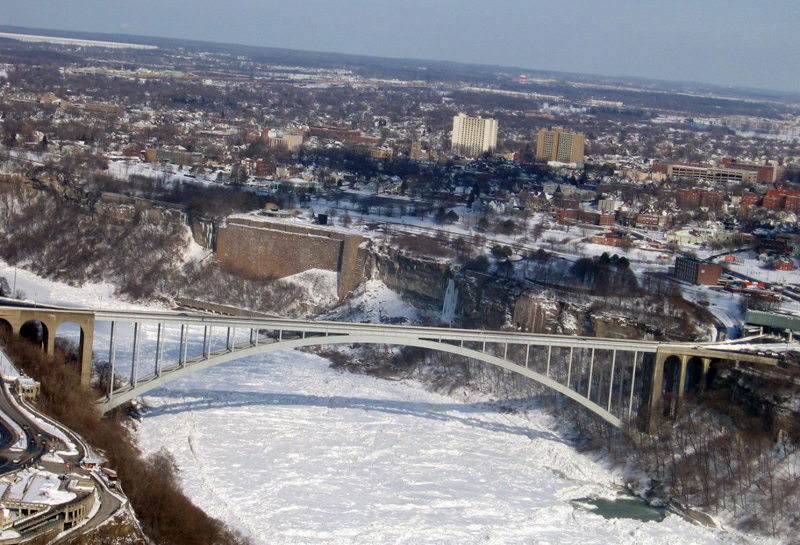 El rainbow bridge, que sortea el río Niágara uniendo Estados Unidos y Canadá, salta sobre la masa de hielo en la que se ha transformado el cauce.