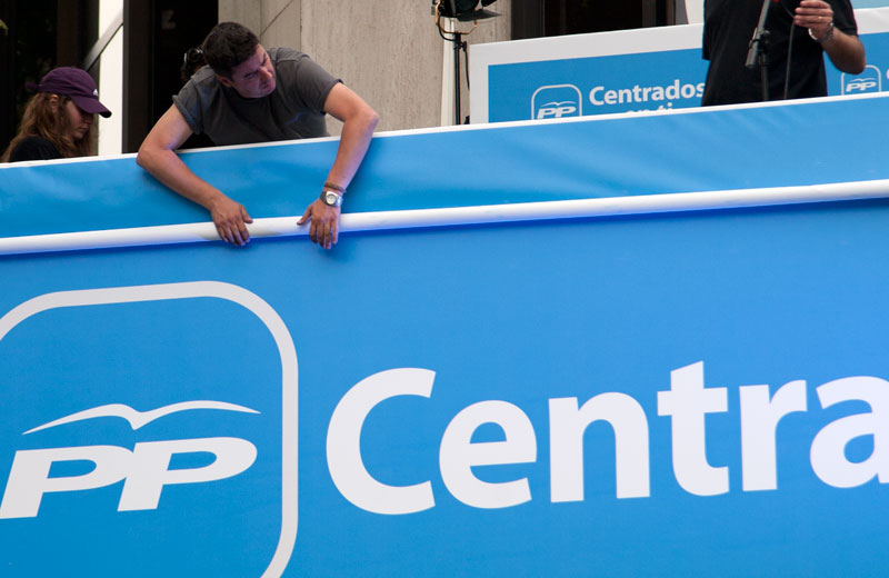 Un operario da los últimos retoques a la tribuna desde la que a lo largo de la noche saldrán a saludar los líderes populares.