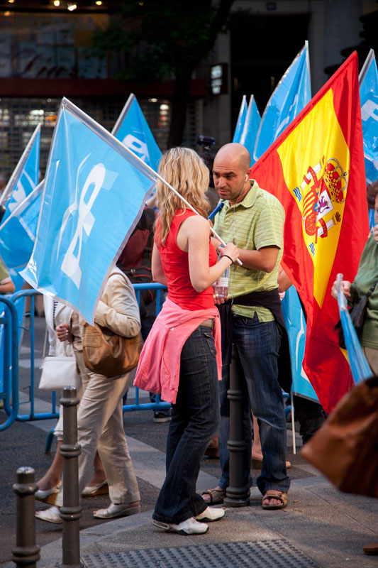 Poco después de las 8 de la tarde hacen acto de presencia frente a la sede de Génova los primeros simpatizantes del PP con sus banderas.