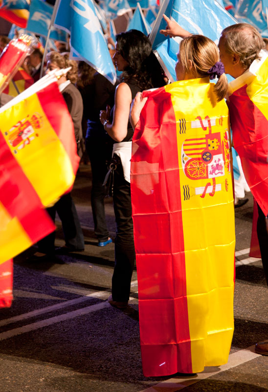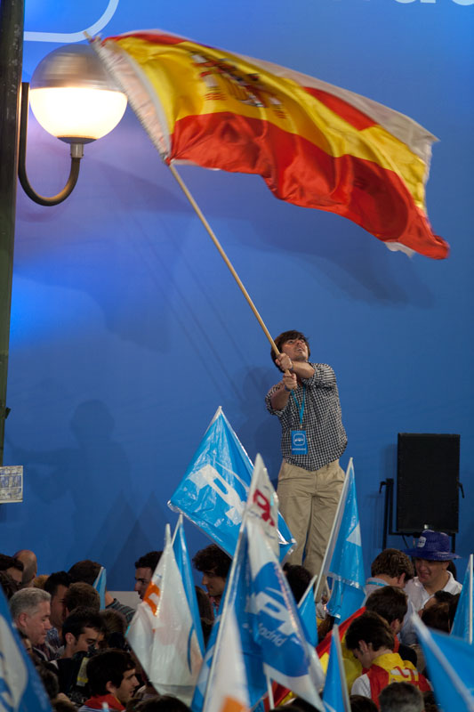 Un joven agita una bandera de España entrelazada con una del Partido Popular.