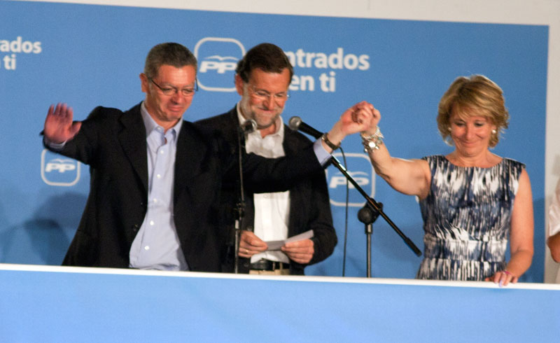 Esperanza Aguirre y Alberto Ruiz Gallardón se cogen de la mano en el estrado. Han ganado tanto en la comunidad como en el ayuntamiento.