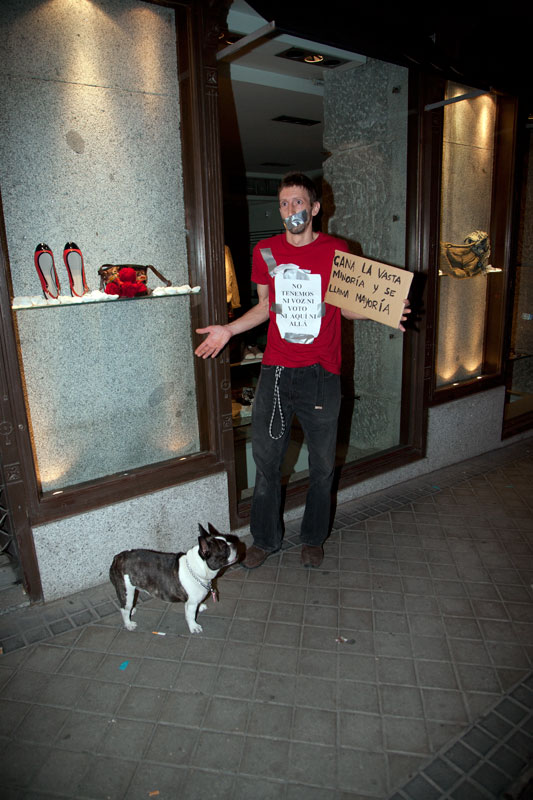 Uno de los acampados en la Puerta del Sol ha subido con su perro hasta la calle Génova para manifestarse en solitario. Sin demasiado éxito, todo sea dicho.