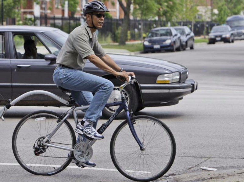Barack Obama montando en bicicleta vestido de manera sport.