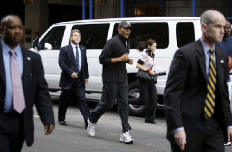 Se ve que Obama tiene más estilo haciendo footing que la estantánea que pudimos ver de Zapatero en Corea del Sur. Rodeado de sus guardaespaldas, Obama se lanza a correr.