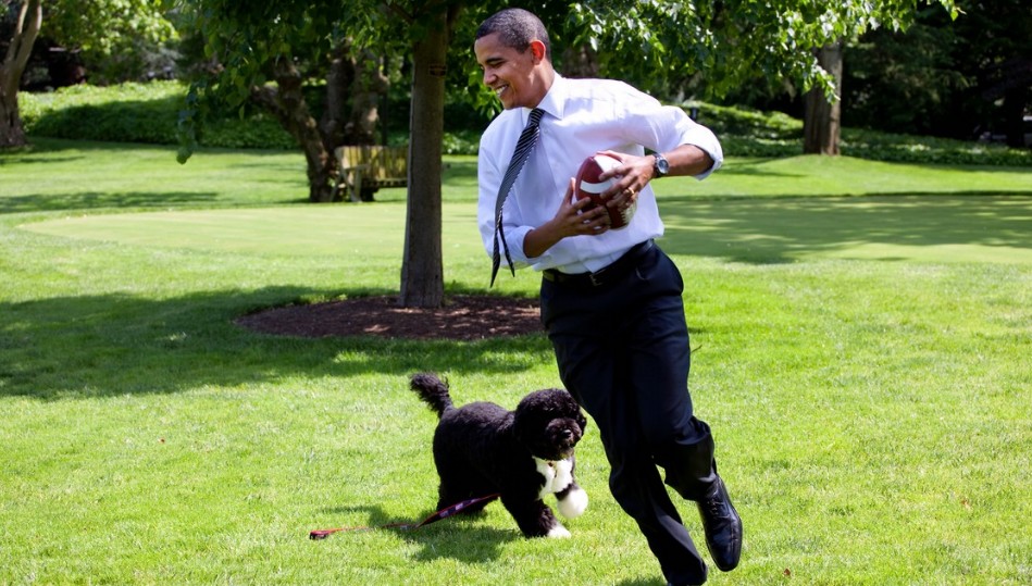 El presidente juega con su perro acompañado de su pelota de fútbol americano.