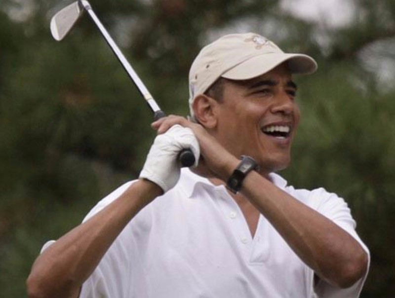 El presidente sonríe después de probar su swing. Obama es un gran aficionado al deporte de Tiger Woods.