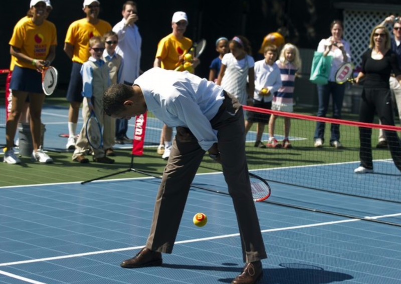 Barack Obama aparece en un acto intentando jugar al tenis. También se le ha podido fotografiar con las grandes figuras del deporte de la raqueta en su país como Sam Querrey o los hermanos Bryant.